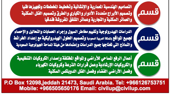 تشرف بالعرض على أنظاركم الكريمة التعريف الفني والمهني لمكتبنا الهندسي الإستشاري والمرفق به إعتمادات المكتب الهندسي لدى الجهات الحكومية والجهات الخاصة والمهام والأنشطة الخاصة بمكتبنا الإستشاري والمشاريع والإتفاقيات والمشاركات التي نفذها مكتبنا الهندسي الإستشاري المعتمد من قبل الهيئة السعودية للمهندسين والمتخصص في تقديم خدمات الهندسة المدنية الإنشائية والهندسة المعمارية والذي نرجو أن تحوز خدماتنا الهندسية على رضاكم التام واعدين إياكم أن نكون عند حسن ظنكم للوصول إلى الأهداف المرسومة والمطلوب تحقيقها من قبلكم بأقل التكاليف المادية وحيث أن لدينا خبرتنا في كافة المجالات الهندسية بفضل الله