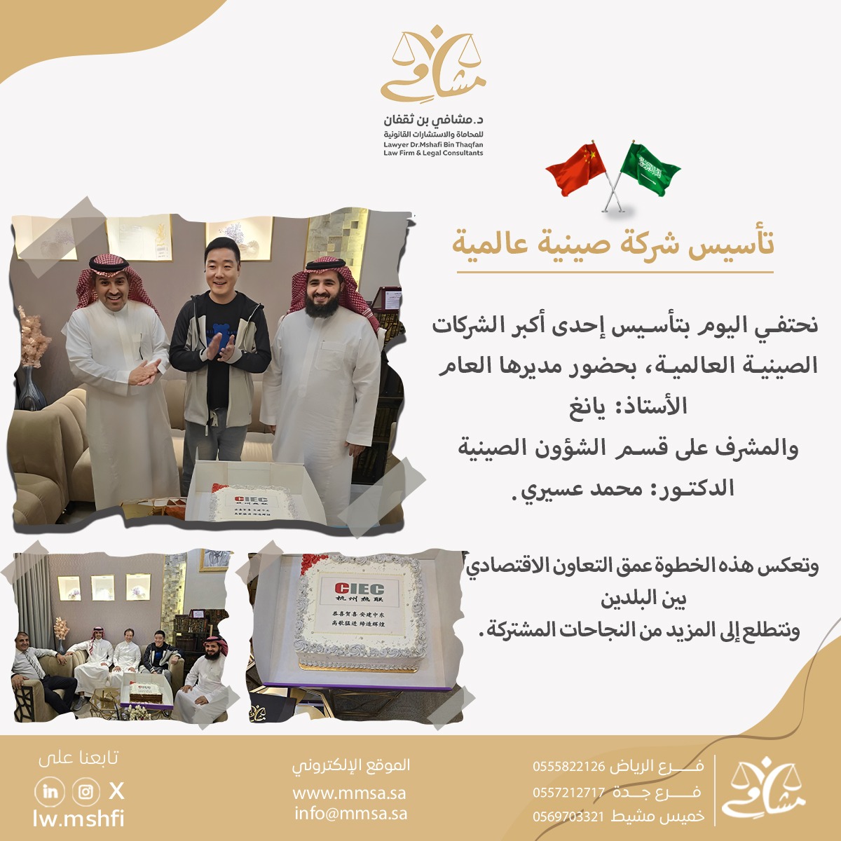 نحن مكتب المحامي : د. مشافي بن ثقفان للمحاماة والاستشارات القانونية واعمال التحكيم والتوثيق ،فريقنا يضم نخبة متميزة من باحثين شرعيين ومحامين ومستشارين قانونيين محليين ودوليين ذوي خبرة تفوق الثلاثين عامًا ومن خريجي أفضل الجامعات العربية والأمريكية والصينية والعالمية وذلك كله للارتقاء بالخدمات المقدمة مما يجعلنا مؤهلين لتقديم أفضل الحلول النظامية لأي صعوبات تواجه العملاء من خلال تطبيق مبدأ العناية القانونية اللازمة والقائمة على مفهوم الاحتراز من وقوع النزاع أو نشوء الخلافات.