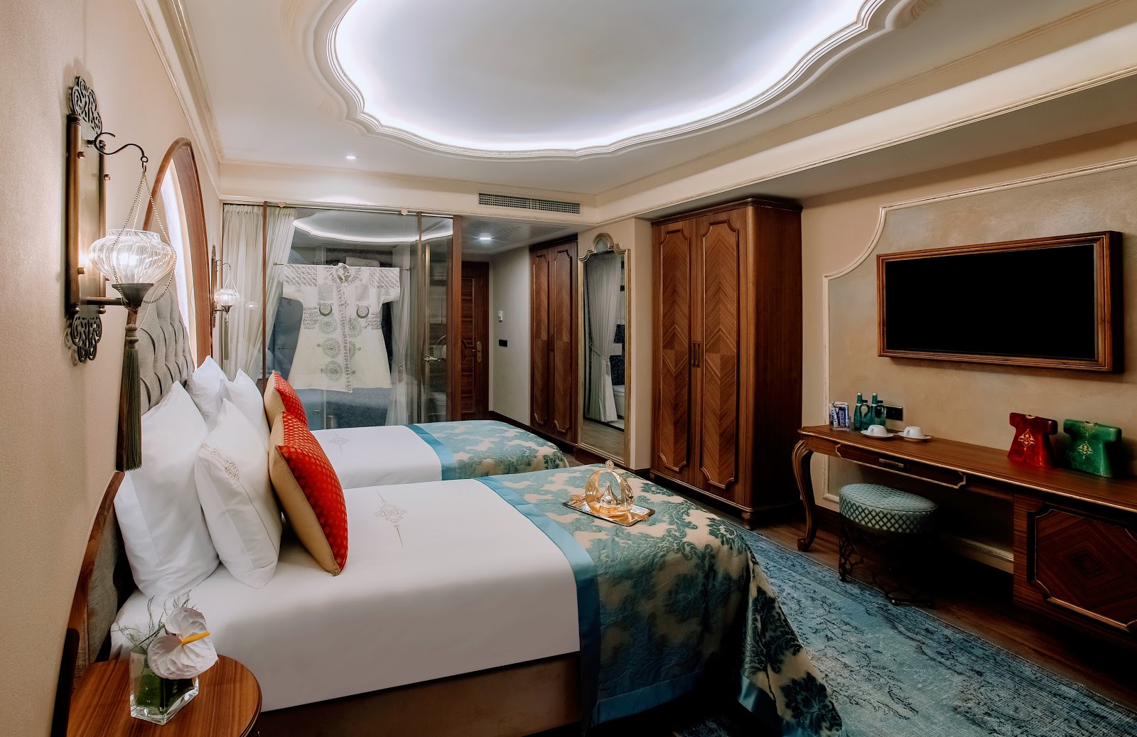 كجزء من الديكور الأنيق لفندقنا على طراز القصور العثمانية، تم تصميم كل غرفة حول قميص تعويذة مختلفة ذات قصة فريدة من نوعها. كل قميص معروض في فندقنا هو نسخة مقلدة مصنوعة يدوياً من مجموعة الملابس السلطانية في قصر طوب قابي التي تعود للقرن السادس عشر.