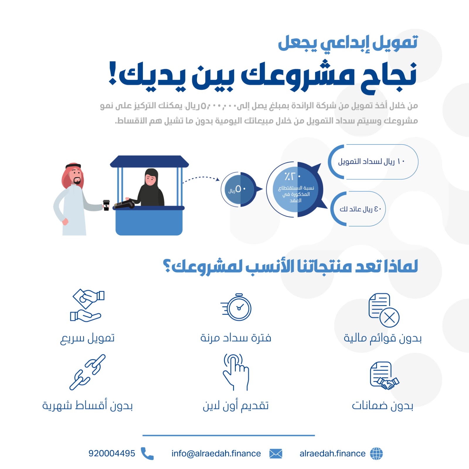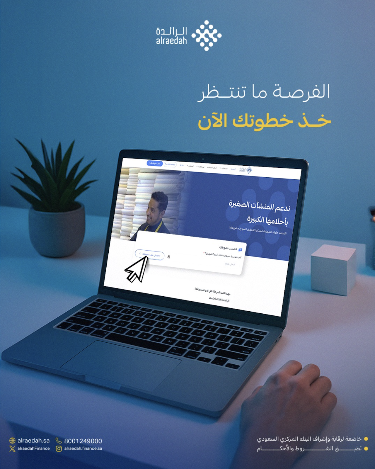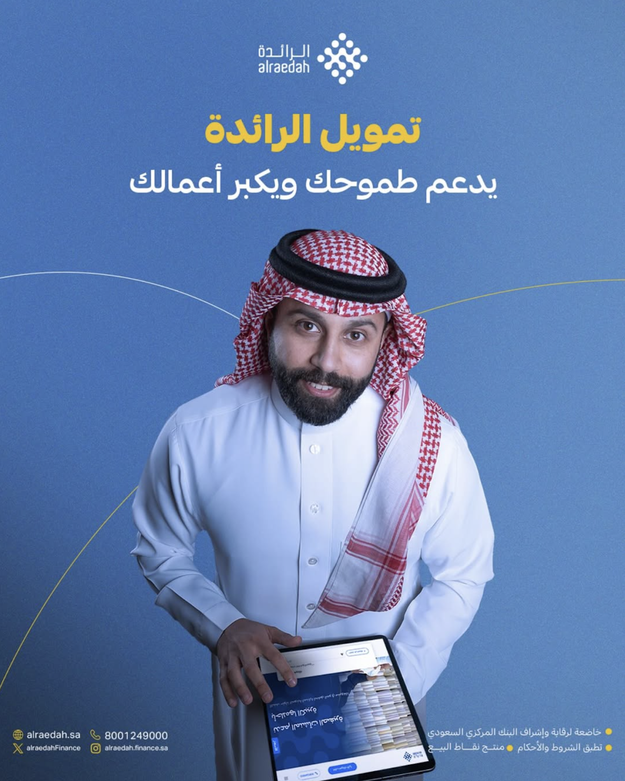 تُعدّ الرائدة للتمويل رائدةً في تقديم حلول تمويلية مُصممة خصيصًا للمؤسسات الصغيرة والمتوسطة الساعية إلى تحقيق نمو مستدام طويل الأجل. منذ تأسيسها عام ٢٠١٦، أصبحت الرائدة المؤسسة التمويلية الرئيسية للمؤسسات الصغيرة والمتوسطة في المملكة العربية السعودية. ويستند نجاحنا إلى إجراءاتنا البسيطة والشفافة، وفهمنا العميق للسوق المحلية، وبرامجنا التمويلية المرنة.