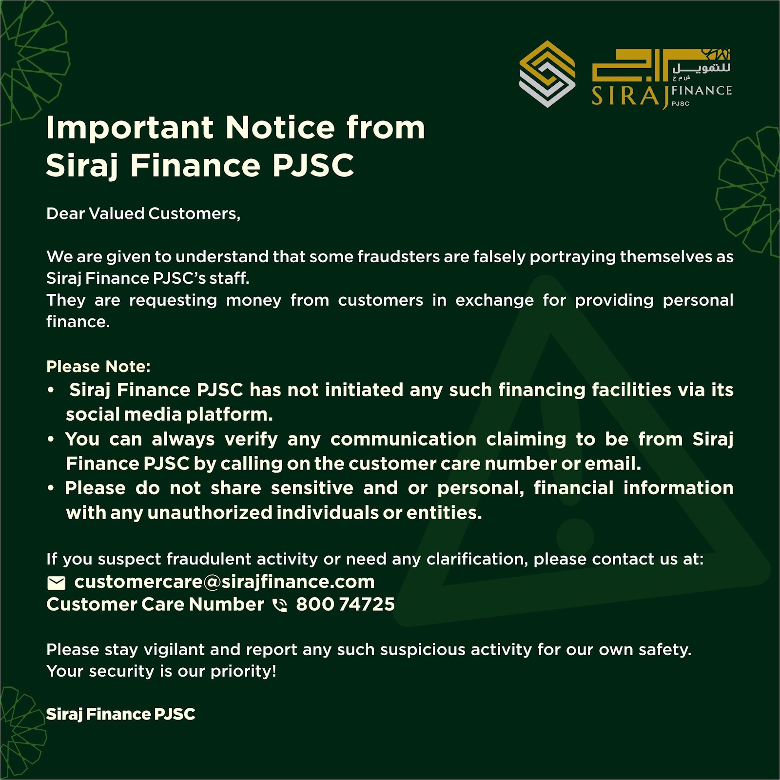 وإذ نحتفل باليوبيل الفضي، فإننا نفخر بمسيرتنا ونتطلع إلى ترسيخ مكانة سراج للتمويل بوصفها المؤسسة المالية الإسلامية الرائدة غير المصرفية في دولة الإمارات. ونواصل التزامنا بدفع عجلة النمو والازدهار المالي لعملائنا الكرام مع تركيز ثابت على الابتكار والحلول المتمحورة حول العملاء.