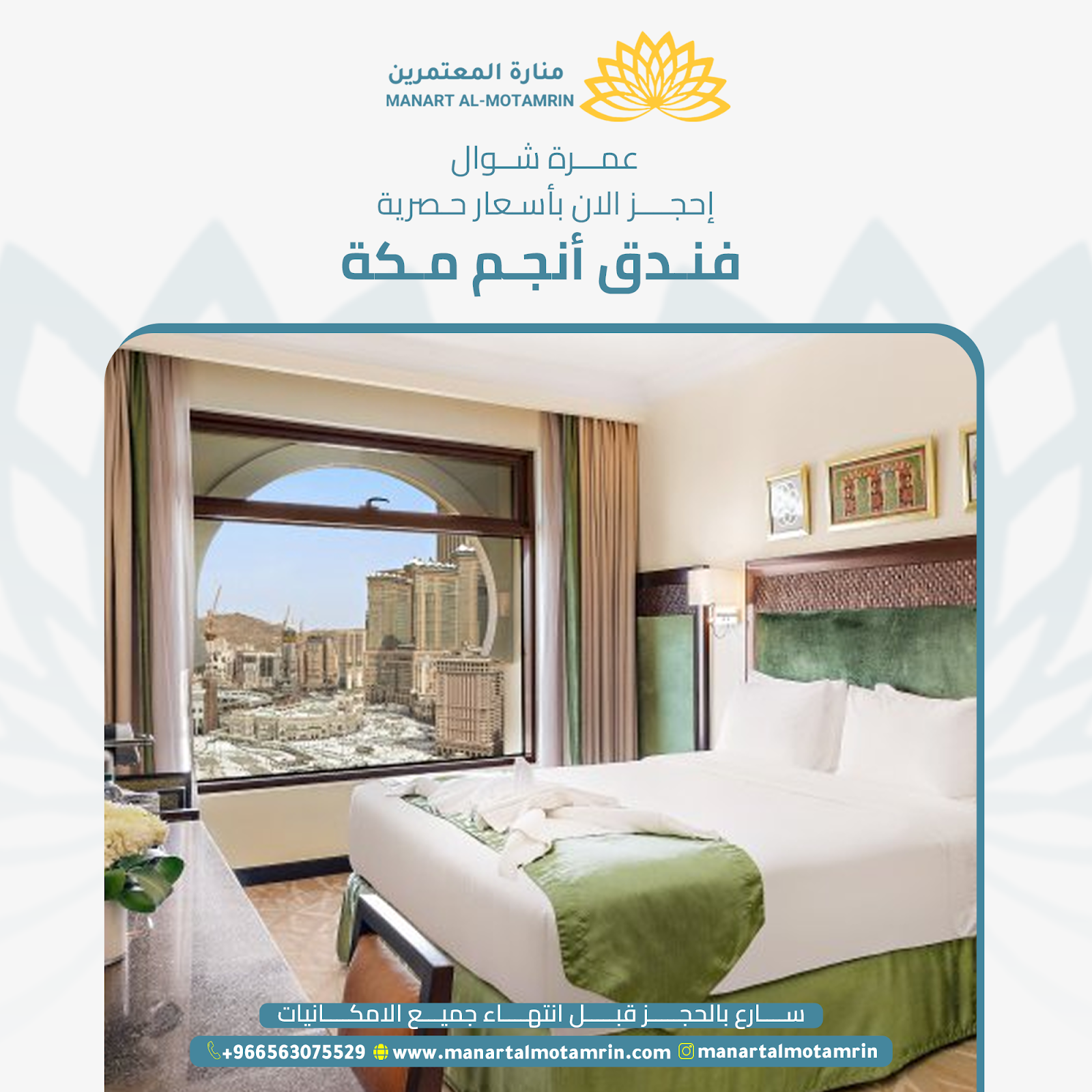 مرحبًا بكم في “منارة المعتمرين” – وجهتكم المثالية لحجز الفنادق في مكة المكرمة والمدينة المنورة لأداء مناسك الحج والعمرة. نحن هنا لتوفير تجربة فريدة وسهلة لجميع المسلمين الراغبين في أداء مناسكهم، مع ضمان الراحة والتسهيلات في كل خطوة من خطوات رحلتهم.